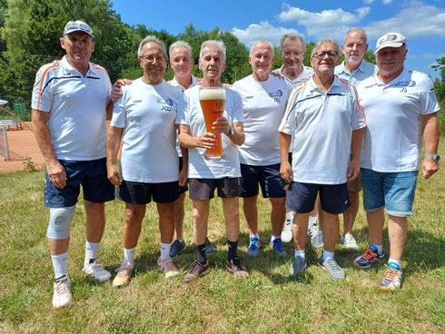 MF Engelbert Bikowski, Jürgen Weber, Manfred Kipper, Werner Bieber mit Meisterbier, Rudi Sapich, Dietmar Niedermeier, Achim Gerlinger, Jörg Faulhaber, Joachim Sapich (verletzt)